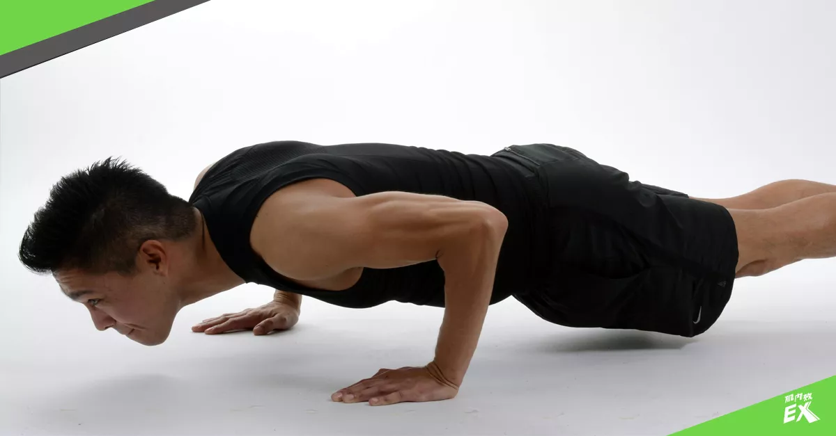 這種夾手肘式的伏地挺身,需要更強健的肱三頭肌與前三角肌才能完成。