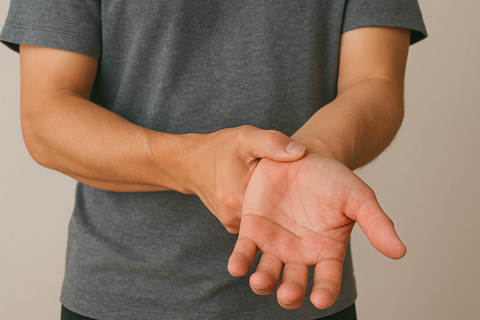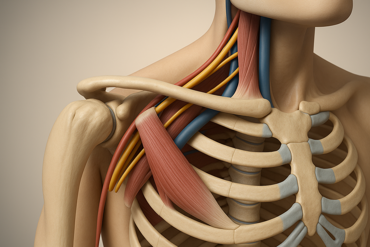 主要原因是頸部的「斜角肌」和胸部的「胸小肌」緊繃,壓迫到從旁邊經過的神經和血管,導致上肢感覺異常、麻木、無力、血液循環不良、感到冰冷等等。
