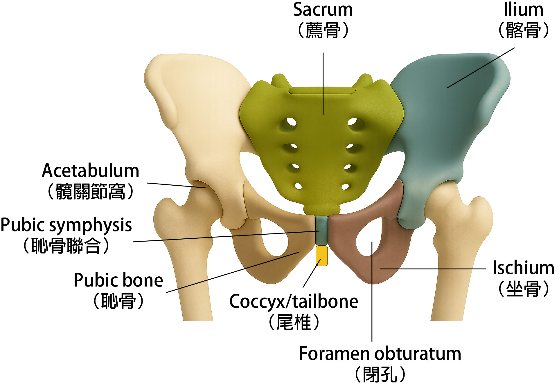 根據陳哥的例子,我們可以知道,其實足部、膝蓋還有骨盆的問題是很密切的,如果真的受傷嚴重,腰椎、胸椎甚至是肩膀與頸椎也會連帶著受到影響,千萬不可輕忽!頭痛醫頭、腳痛醫腳的時代已經過去了,整體且全面的檢查才能發現問題的根源!以下為大家介紹骨盆的構造以及案例中的陳哥為什麼一個屁股蹬地,會導致膝蓋疼痛的原因。首先介紹組成骨盆的八個構造,圖文如下: