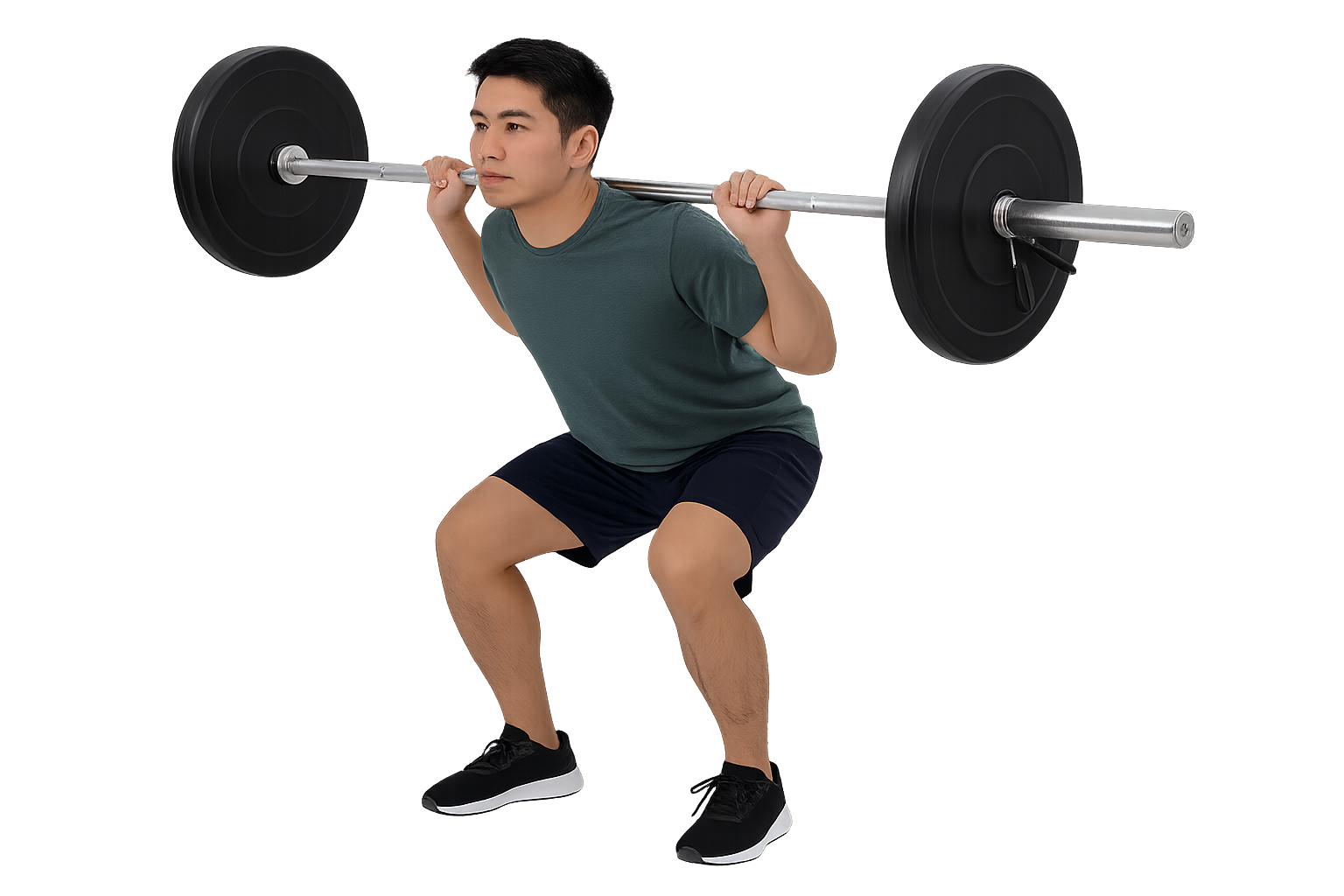 2.下蹲時,屁股往後下方坐、夾起髖關節、勾起腳背。過背部打直、挺胸,軀幹維持緊繃成棒狀。肩膀、膝蓋、腳尖大致維持一線,身體不會過分前傾或是後傾,膝蓋不會外翻或內夾。