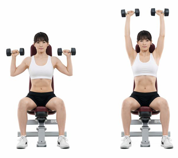 動作過程:坐姿,雙臂打開,手持啞鈴,用穩定的速度將啞鈴推舉到肩膀正上方,停留1-2秒,穩定之後將啞鈴慢慢下放至肩膀上(或稍近處)這樣為一個完整的動作過程。推舉時吐氣、下放時吸氣。