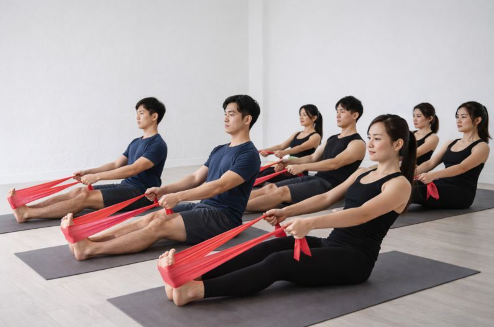 現在坐式生活下許多人背肌無力或不知如何出力,一開始就使用啞鈴或槓片可能還是會太重而產生代償的現象,可以改由使用輕度的彈力帶開始訓練。坐在地上雙腳微開,彈力帶中段套在腳上雙手抓住兩端,上半身不晃動上臂靠著身體,屈肘並將肩胛骨向後夾。