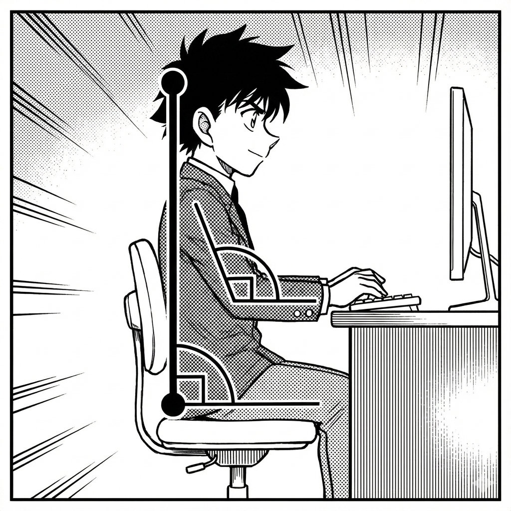 要有正確的坐姿,桌椅的高度很重要!椅子最好跟膝蓋同高,頭、胸、臀要呈一直線,腳記得要踩地,不要翹腳。另外,因為辦公室的椅子常常是微微往後傾斜的,最好坐椅子的如果是常常需要看電腦的上班族,電腦螢幕的位置最好也要配合,跟自己的視線平視是最好的唷!(工作需要用到雙螢幕的朋友,也要盡量以自己為中心放置螢幕,不要偏向某一側,以免讓自己某一側的頸部肌肉緊繃)