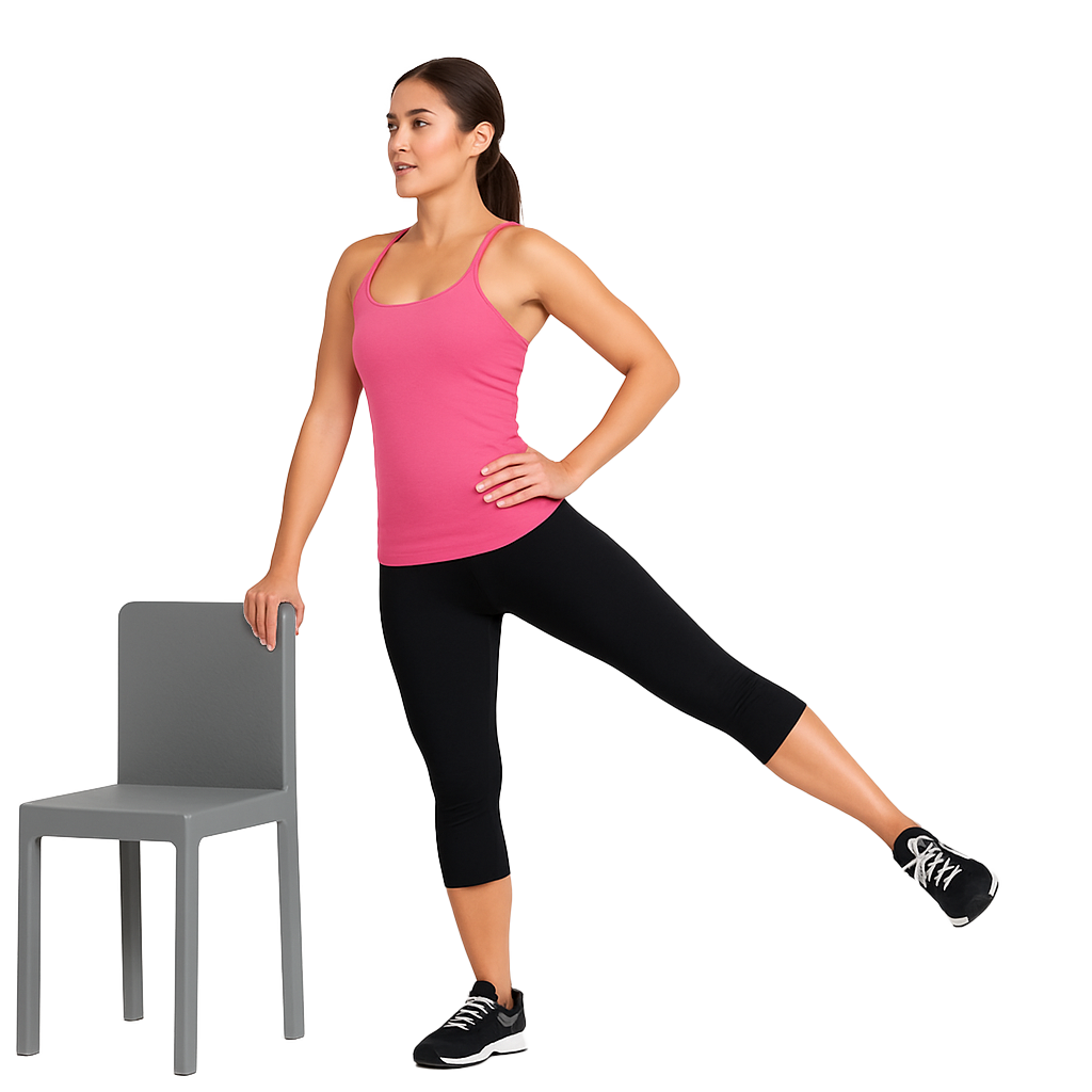採取站姿,可單手扶牆壁或椅背穩定重心,將打腿往外側邊展開抬起。抬起後可在空中稍微停留維持3~5秒,增加肌肉的耐力與穩定。要注意的是,身體不可跟著向側邊傾倒或扭曲,必須維持著身體保持直立與平衡。