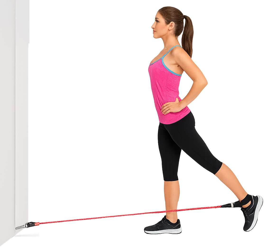 採取站姿,可雙手扶牆。將大腿向後抬起,身體保持直立,不可向前或向側邊扭曲,也不需要刻意像芭雷舞姿般將背脊向後彎曲,以免增加太多下背部壓力。