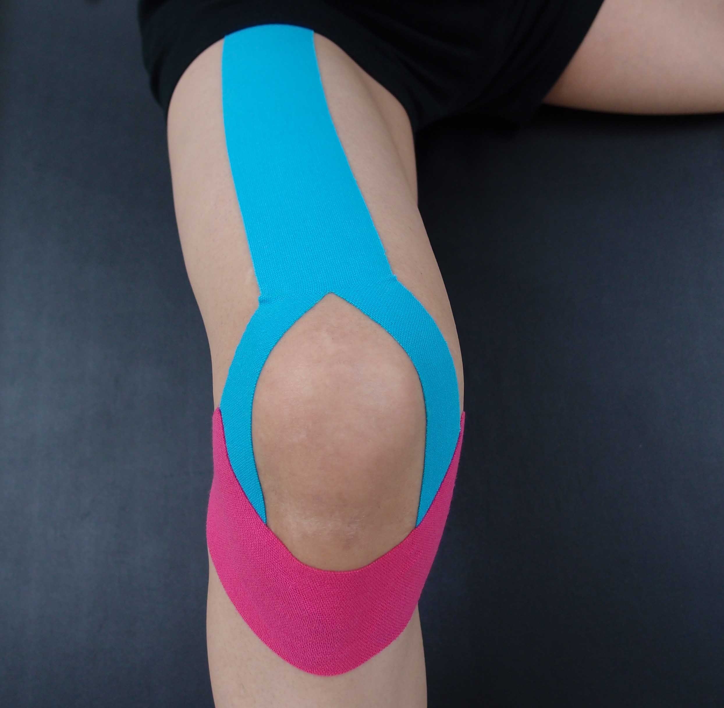 在 1000 公尺負重弓箭步與 100 次藥球投擲中,膝蓋承受極大壓力。選手可透過一條 Y 型貼法穩定髕骨軌跡,再加上一條 I 型橫向貼法,減輕髕骨壓力綜合症,同時輔助股四頭肌收縮,在推雪橇時提供額外的彈性動能。