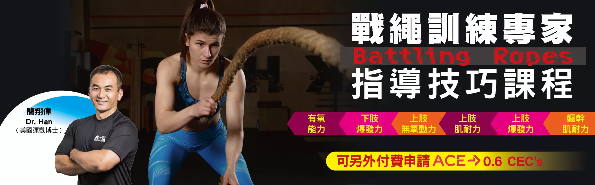 此課程包括戰繩基本介紹、熱身程序、戰繩理論(三個平面訓練與能量系統)、戰繩的抓握法、課程設計原則等。