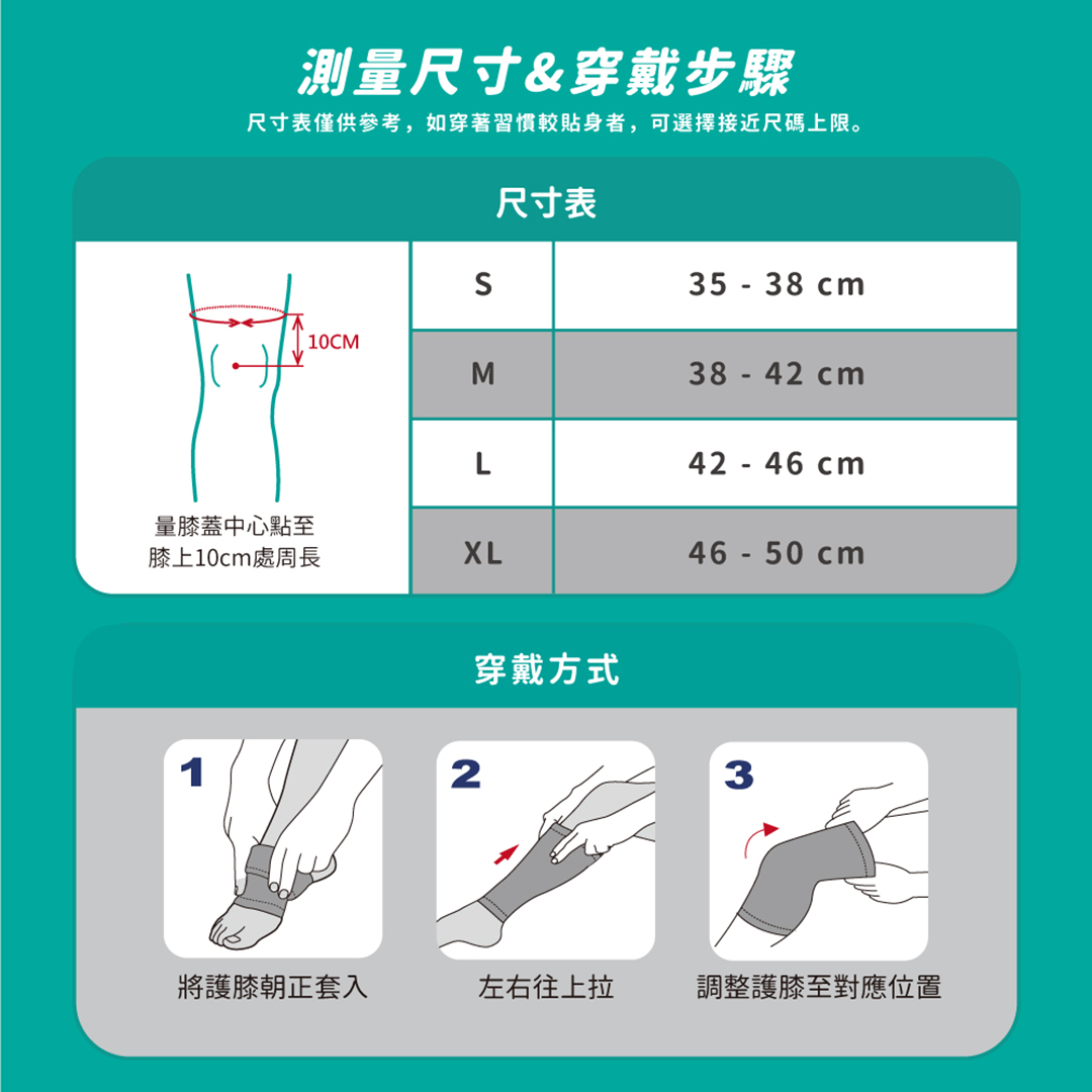 - 穿戴本產品請勿過緊或時間過長,不當的壓力或過久的穿戴會影響血液循環及舒適性。